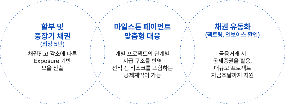 매출채권신용공제는 국내외 민간기업 및 국영기업과의 거래에서 발생하는 채무불이행 리스크로부터 기업을 보호하는 솔루션입니다.